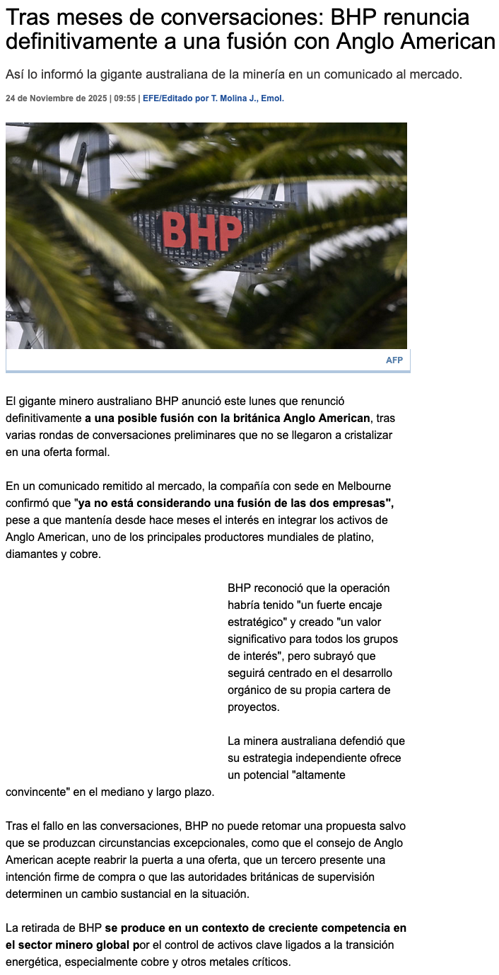 "Ya no está considerado": BHP renuncia definitivamente a la posibilidad de fusión con Anglo American - (biobiochile online)