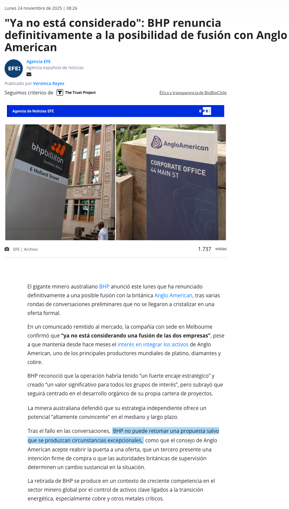 Tras meses de conversaciones: BHP renuncia definitivamente a una fusión con Anglo American - (emol)