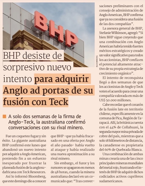 Tras meses de conversaciones: BHP renuncia definitivamente a una fusión con Anglo American - (emol)