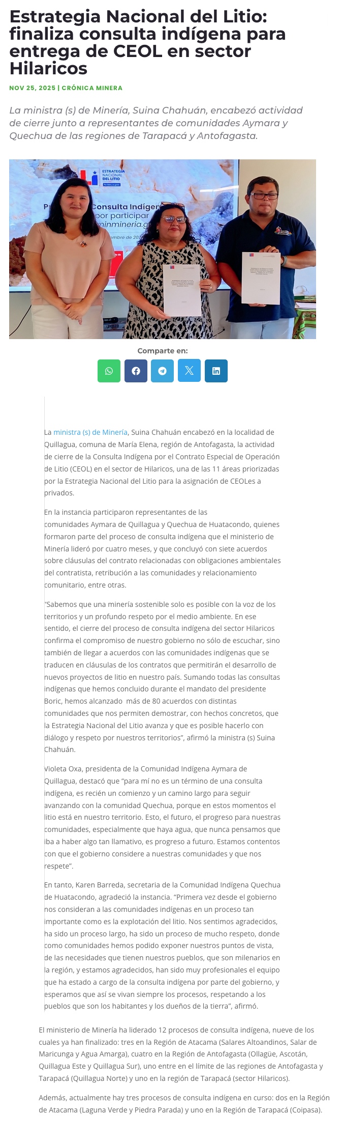 Ministerio finaliza Consulta Indígena para la entrega de CEOL en el sector Hilaricos - (El Mercurio de Antofagasta)