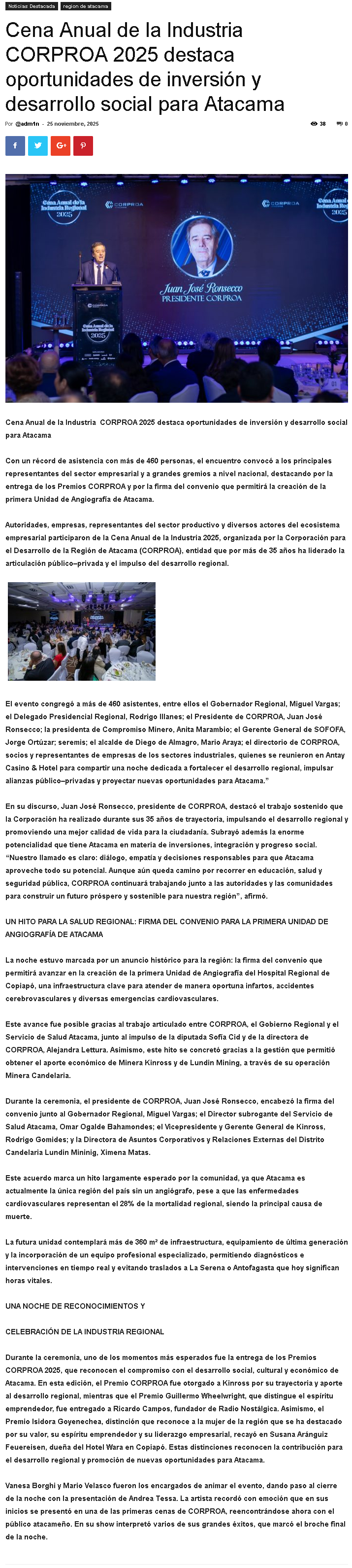 Cena Anual de la Industria CORPROA 2025 destaca oportunidades de inversión y desarrollo social para Atacama - (madero.cl)