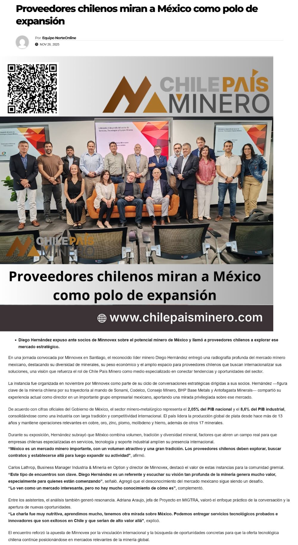 Diego Hernández expone ante socios de Minnovex y destaca el potencial de México para proveedores mineros chilenos - (nuevaminería online)
