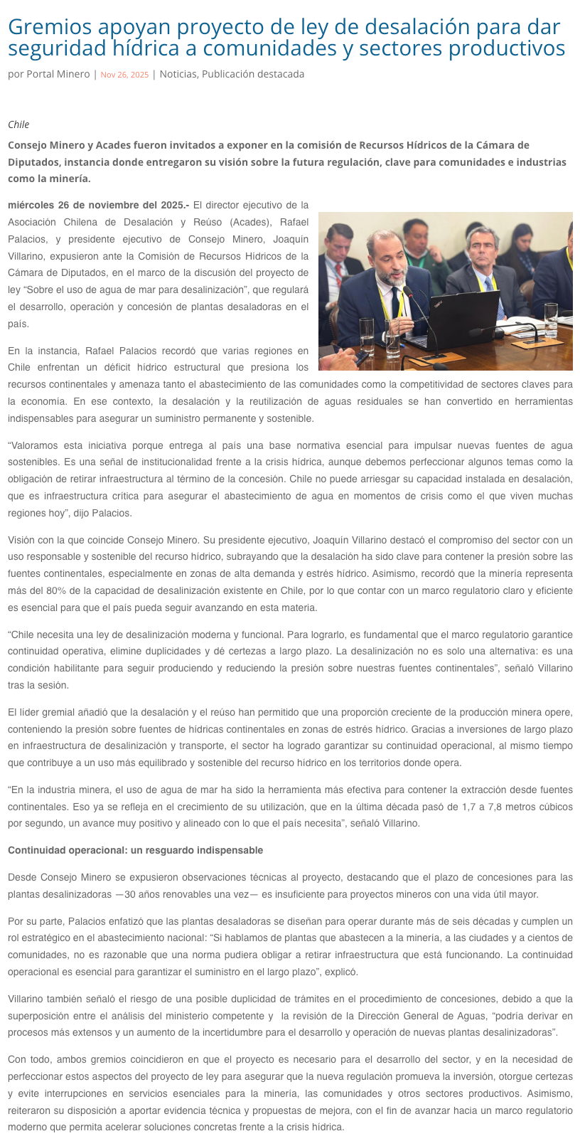 Consejo Minero y Acades entregan observaciones a proyecto de ley sobre desalinización - (mch.cl)