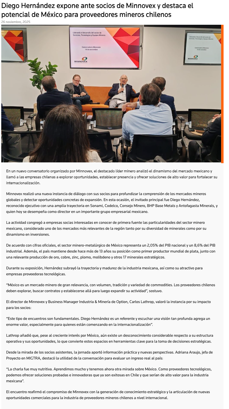 Diego Hernández expone ante socios de Minnovex sobre la minería en México y las oportunidades para proveedores chilenos - (portalminero)