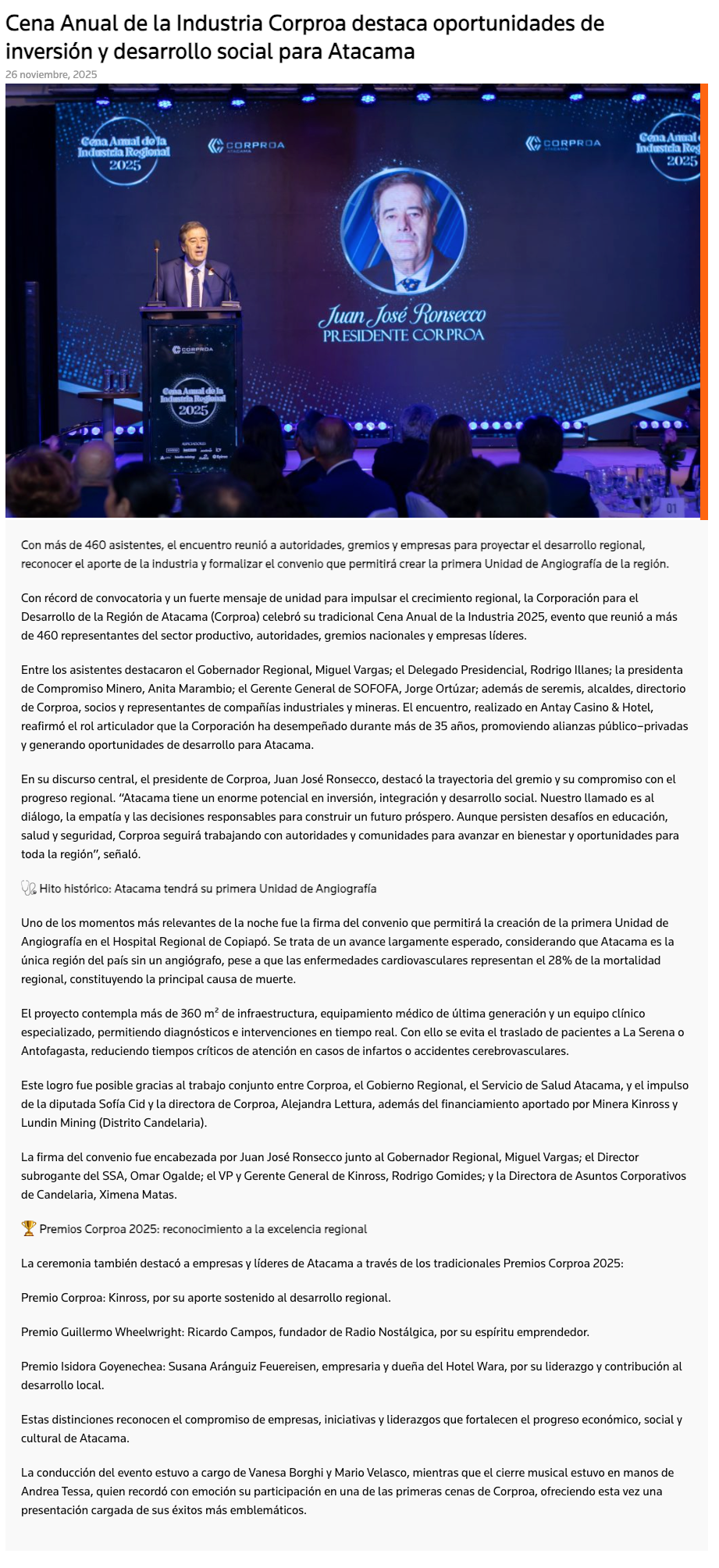 Cena Anual de la Industria CORPROA 2025 destaca oportunidades de inversión y desarrollo social para Atacama - (chanarcillo.cl)