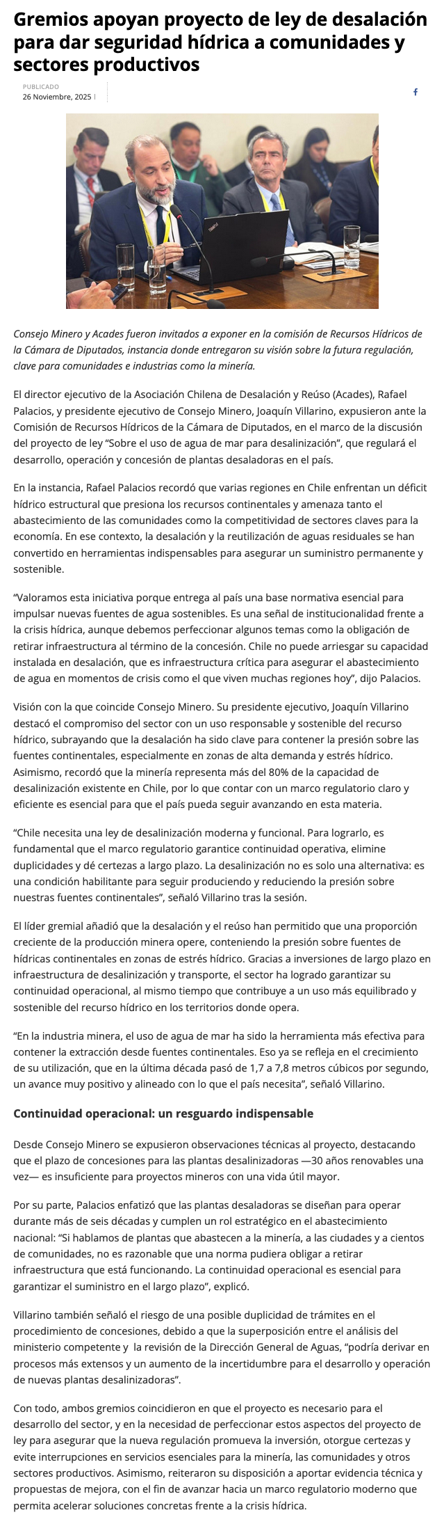 Consejo Minero y Acades entregan observaciones a proyecto de ley sobre desalinización - (mch.cl)