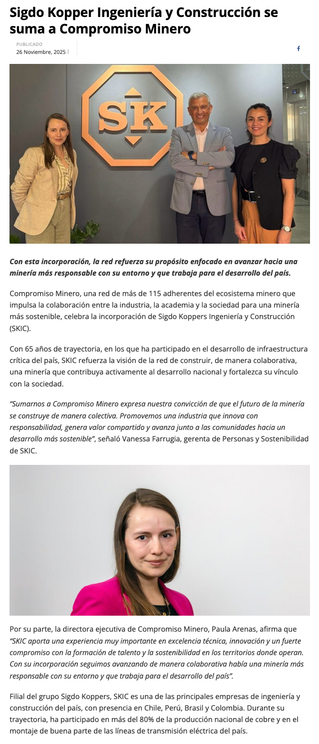 Sigdo Kopper Ingeniería y Construcción se suma a Compromiso Minero - (territoriominero.cl)