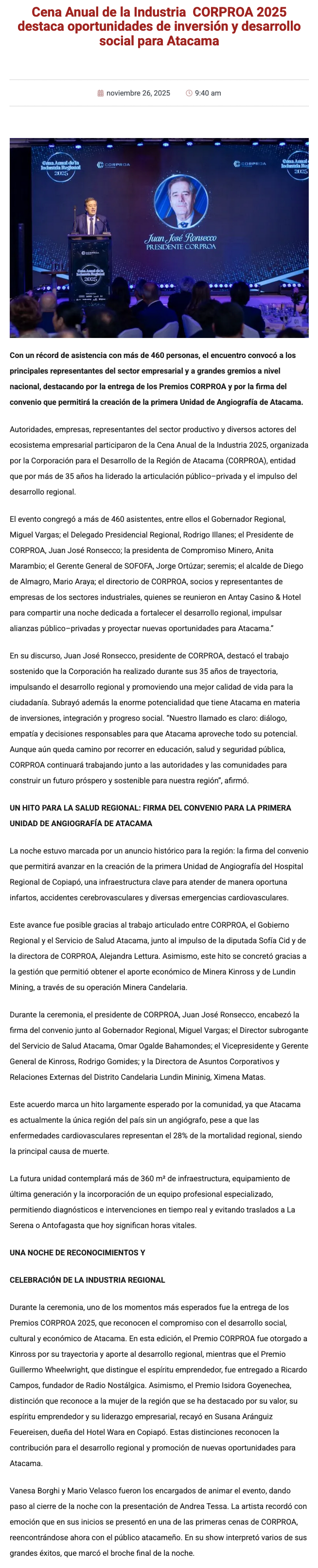 Cena Anual de la Industria CORPROA 2025 destaca oportunidades de inversión y desarrollo social para Atacama - (chanarcillo.cl)