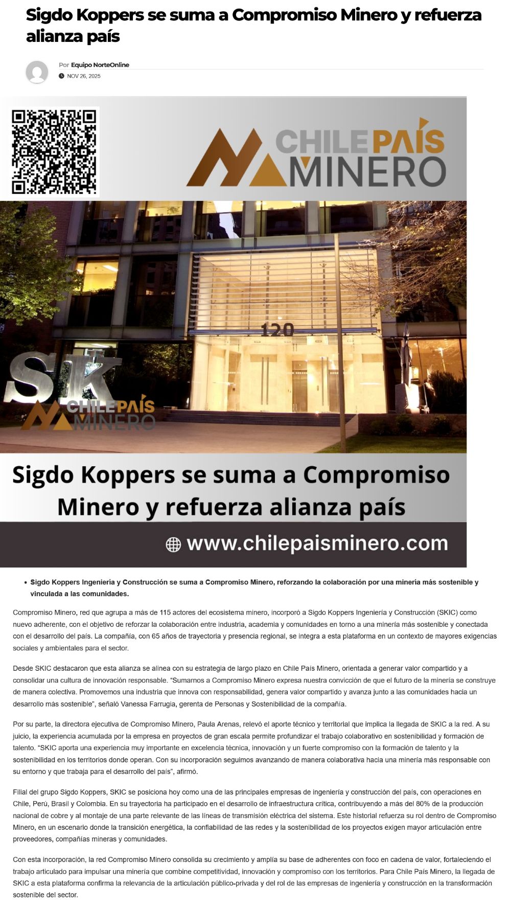 Sigdo Kopper Ingeniería y Construcción se suma a Compromiso Minero - (guiaminera.cl)