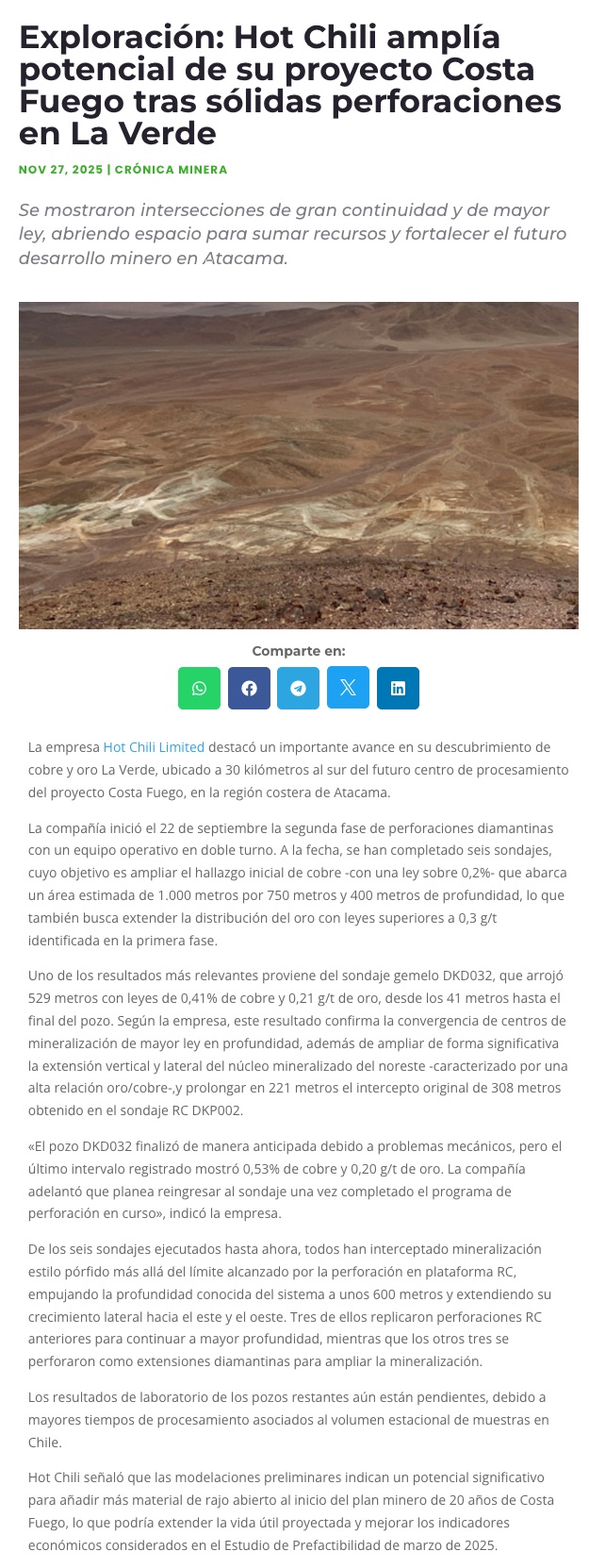 Hot Chili confirma importante descubrimiento de cobre y oro en La Verde - (reporteminero)