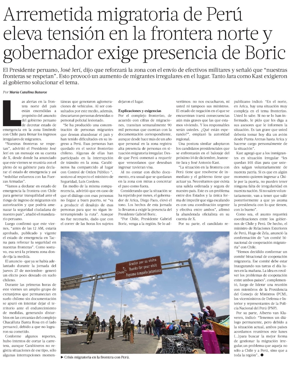 Cancillerías de Chile y Perú abordan la crisis migratoria, con frontera reforzada por FF.AA. - (El Mercurio de Santiago)