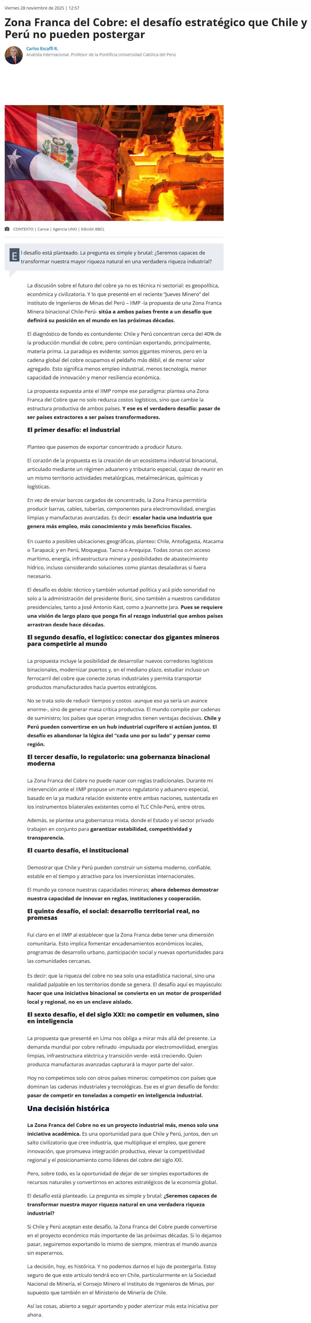 Zona Franca del Cobre: el desafío estratégico que Chile y Perú no pueden postergar - (El Chañarcillo)