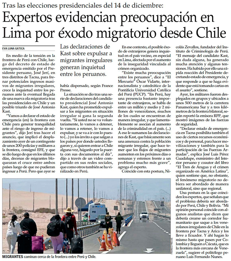 Cancillerías de Chile y Perú abordan la crisis migratoria, con frontera reforzada por FF.AA. - (El Mercurio de Santiago)