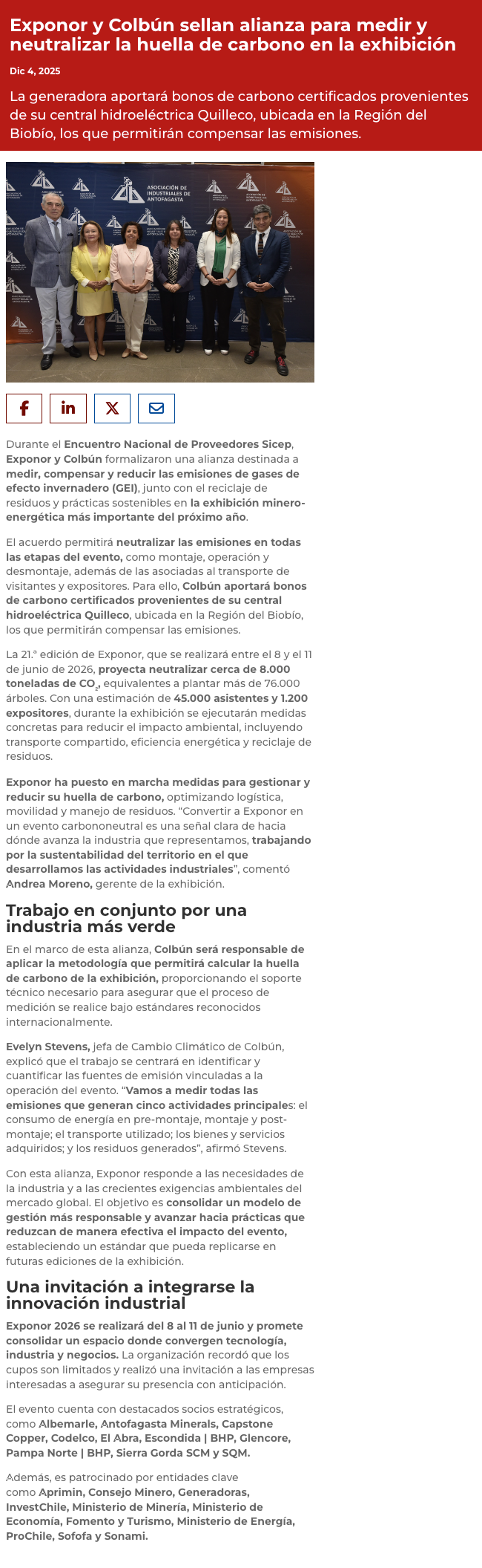 EXPONOR y Colbún sellan alianza para medir y neutralizar la huella de carbono de la exhibición 2026 - (reporteminero)