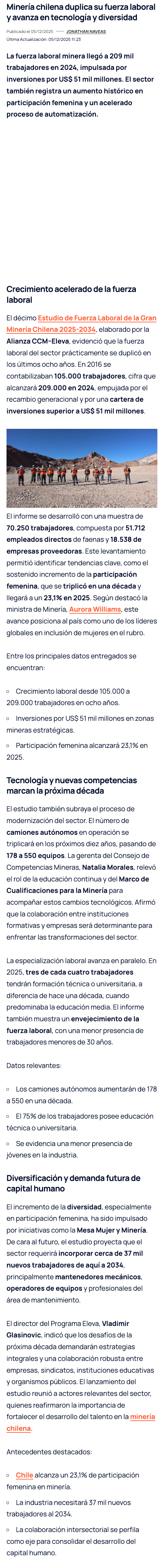 Nuevas tecnologías y una robusta cartera de inversión marcarán la demanda laboral minera en la próxima década - (mineriayfuturo.cl)