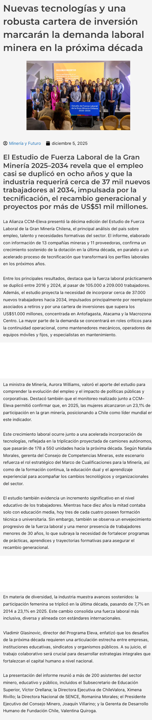 Nuevas tecnologías y gran cartera de inversión macarán la demanda laboral minera en la próxima década - (portalinnova.cl)