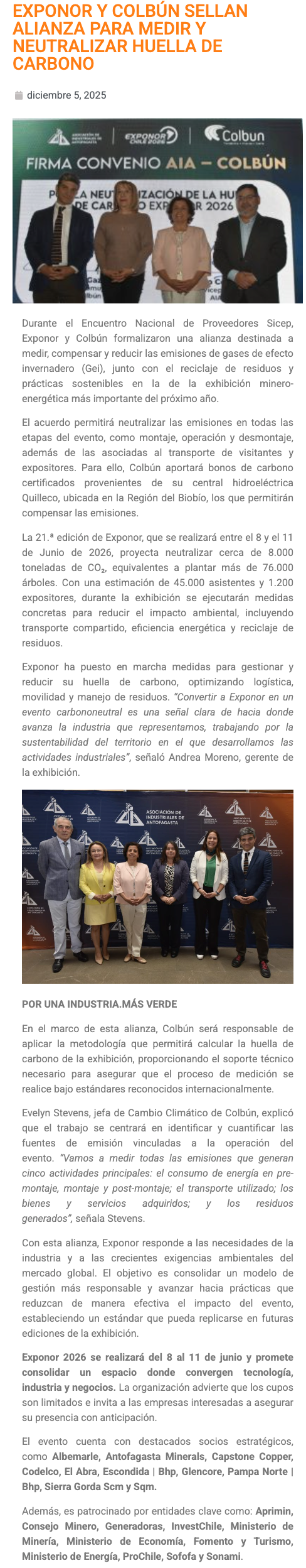 EXPONOR y Colbún sellan alianza para medir y neutralizar la huella de carbono en la exhibición minera de 2026 - (mineriayfuturo.cl)