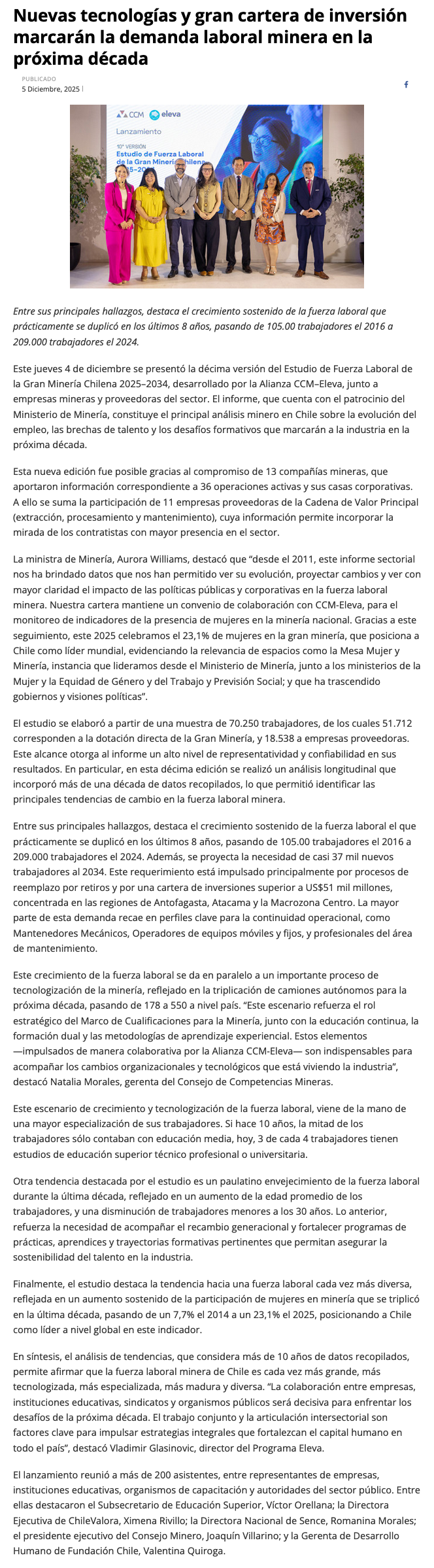Nuevas tecnologías y una robusta cartera de inversión marcarán la demanda laboral minera en la próxima década - (mineriayfuturo.cl)
