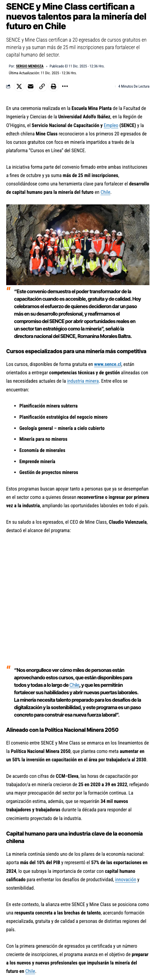 SENCE y Mine Class certifican a nuevos talentos para la minería - (norteonline.cl)