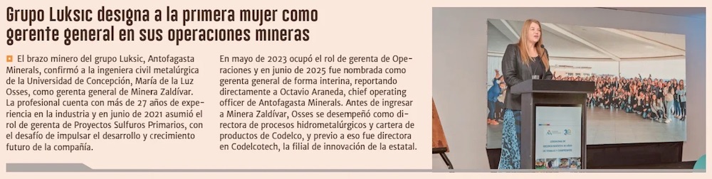 Antofagasta Minerals ratifica a María De La Luz Osses como gerenta general de Minera Zaldívar - (El Mercurio de Santiago)
