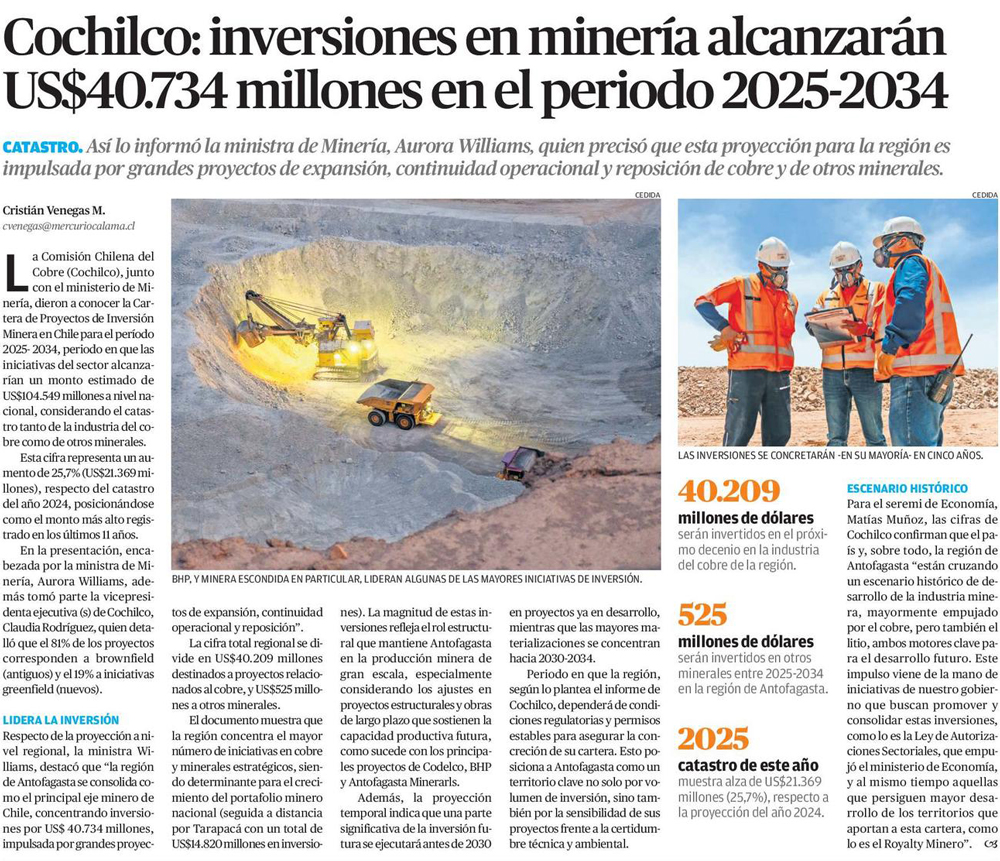 Cochilco proyecta histórica inversión minera en el país para la próxima década - (Pulso)