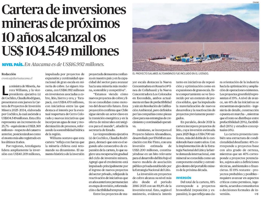Cochilco: inversiones en minería alcanzarán US$40.734 millones en el periodo 2025-2034 - (El Mercurio de Antofagasta)