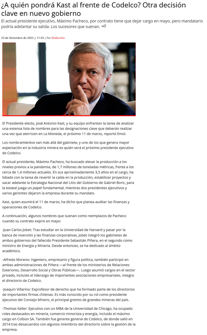 Industria minera atenta: Quién dirigiría Codelco en la era de José Antonio Kast - (emol)