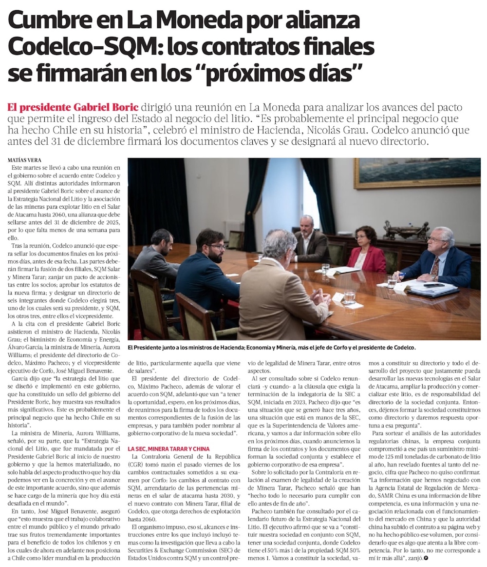 Cumbre en La Moneda por alianza Codelco-SQM: contratos finales se firman en los “próximos días” - (La Tercera Online)