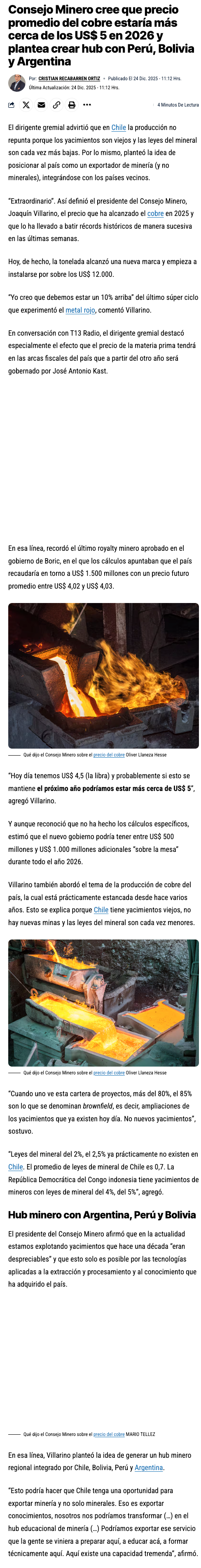 Consejo Minero cree que precio promedio del cobre estaría más cerca de los US$ 5 en 2026 y plantea crear hub con Perú, Bolivia y Argentina - (La Tercera Online)