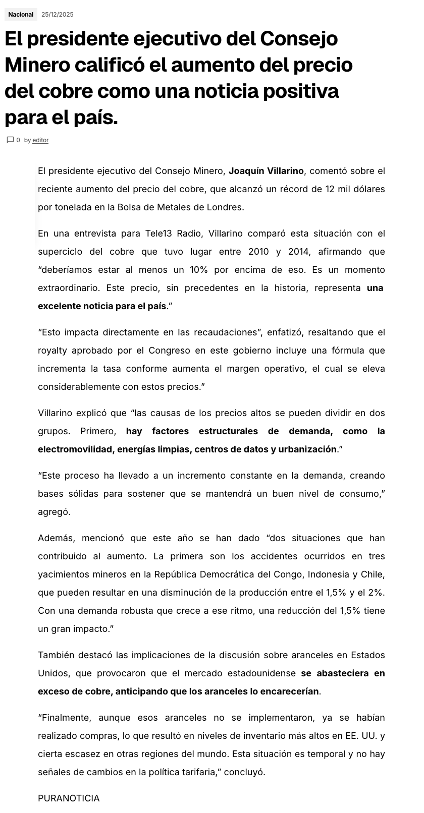 Presidente ejecutivo del Consejo Minero calificó como "una estupenda noticia para el país" el alza en el precio del cobre - (puranoticia.cl)