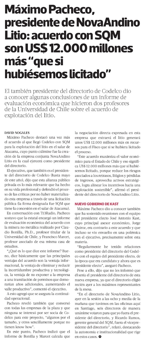 Pacheco: Una licitación no era el mejor camino - (El Mercurio de Santiago)