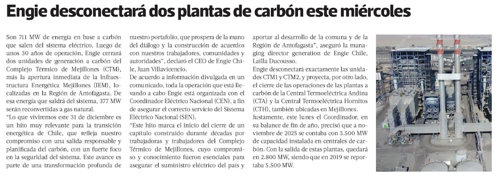 Mejillones: Engie Chile desconecta dos unidades y reconvertirá una a gas natural - (El Mercurio de Antofagasta)