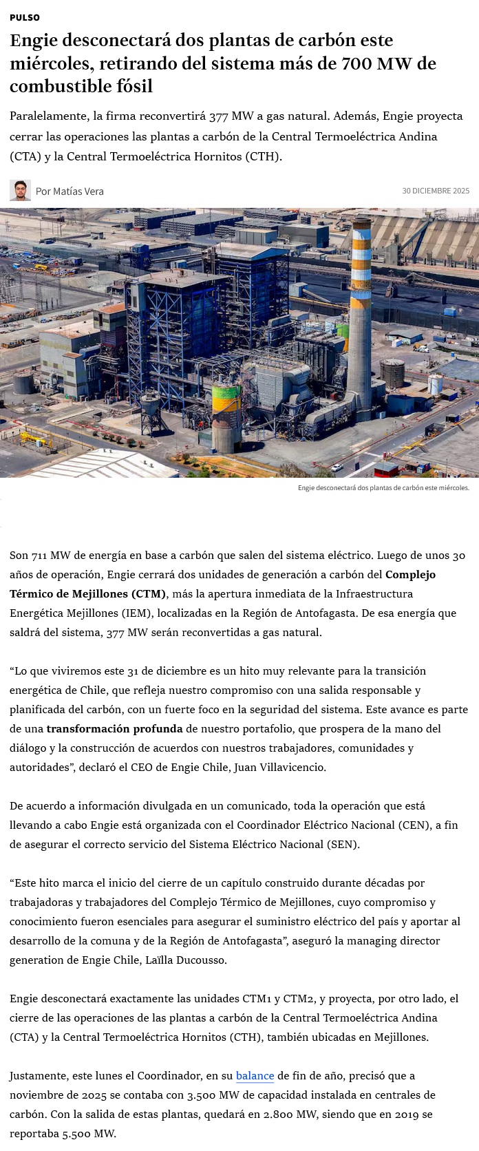 Mejillones: Engie Chile desconecta dos unidades y reconvertirá una a gas natural - (El Mercurio de Antofagasta)