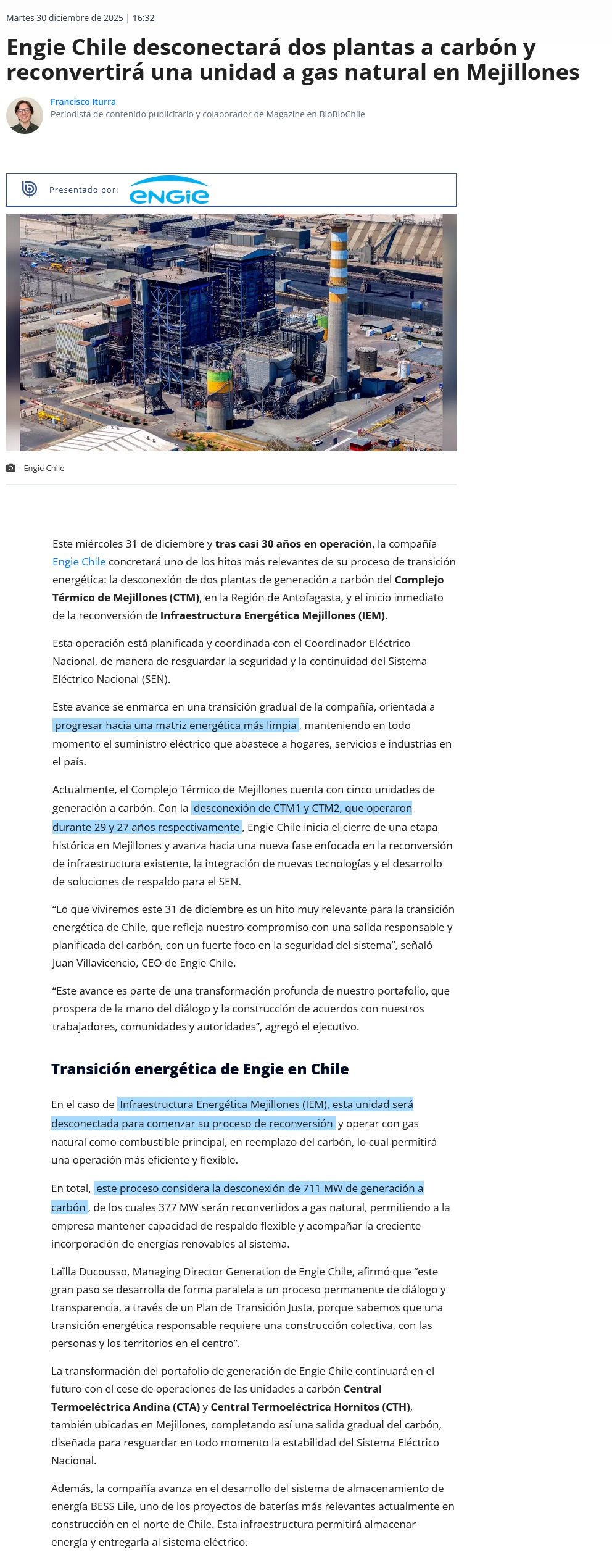 Mejillones: Engie Chile desconecta dos unidades y reconvertirá una a gas natural - (El Mercurio de Antofagasta)