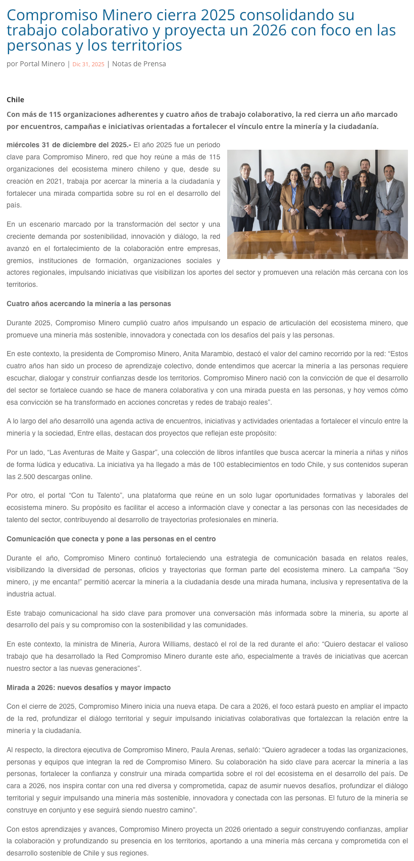 Compromiso Minero cierra 2025 consolidando su trabajo colaborativo y proyecta un 2026 con foco en las personas y los territorios - (mineriayfuturo.cl)