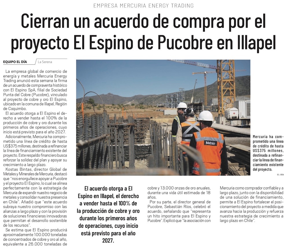 Pucobre cierra acuerdo con gigante internacional Mercuria Energy Group para la venta de cobre de su proyecto El Espino - (Semanario Tiempo)