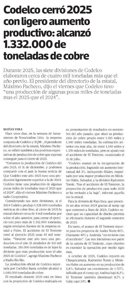 Codelco cerró 2025 con ligero aumento productivo: alcanzó las 1.332.000 toneladas de cobre - (La Tercera Online)