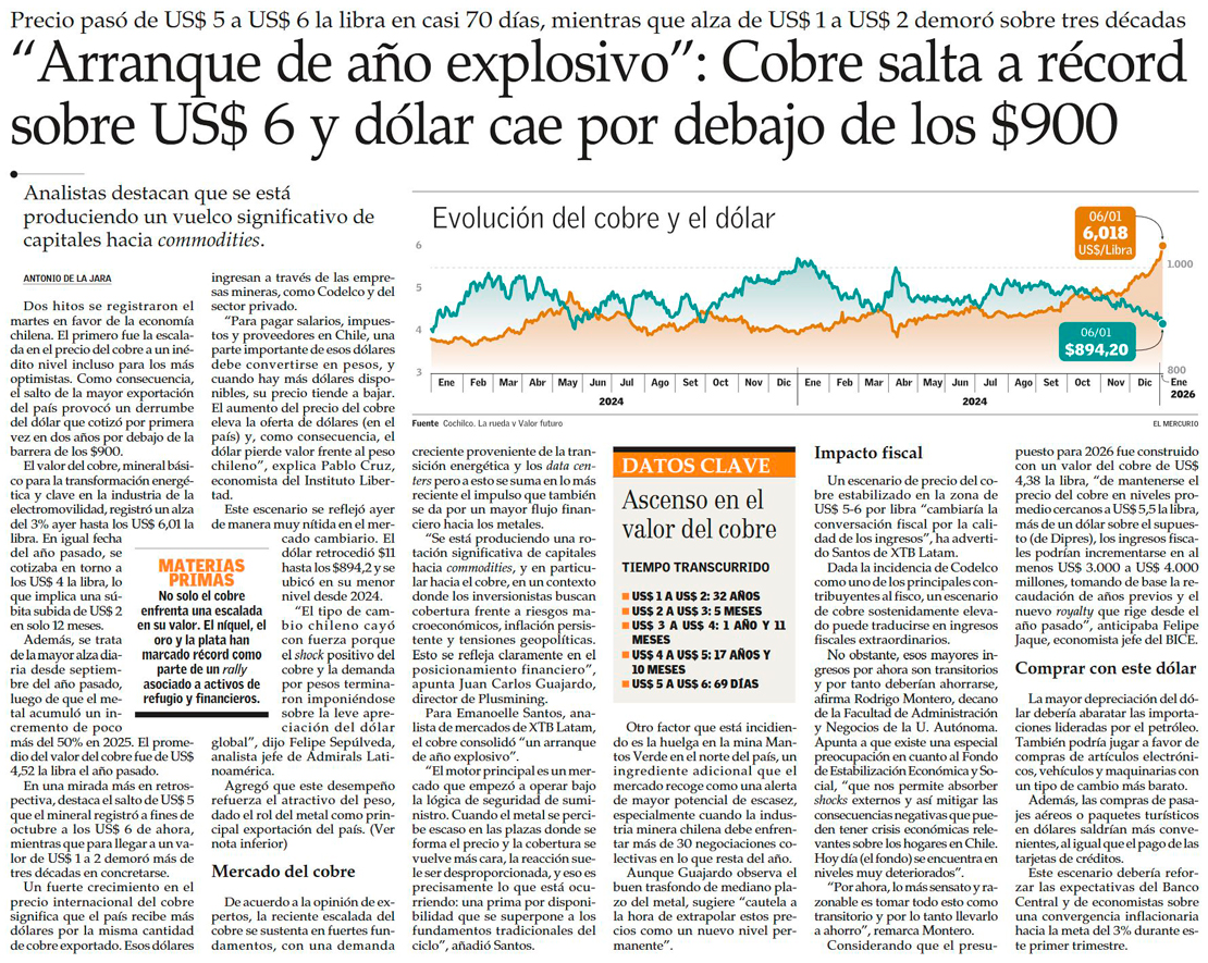 Precio del cobre imparable: cruza la barrera de US$ 6 la libra y empuja al dólar bajo los $ 900 - (Diario Financiero)