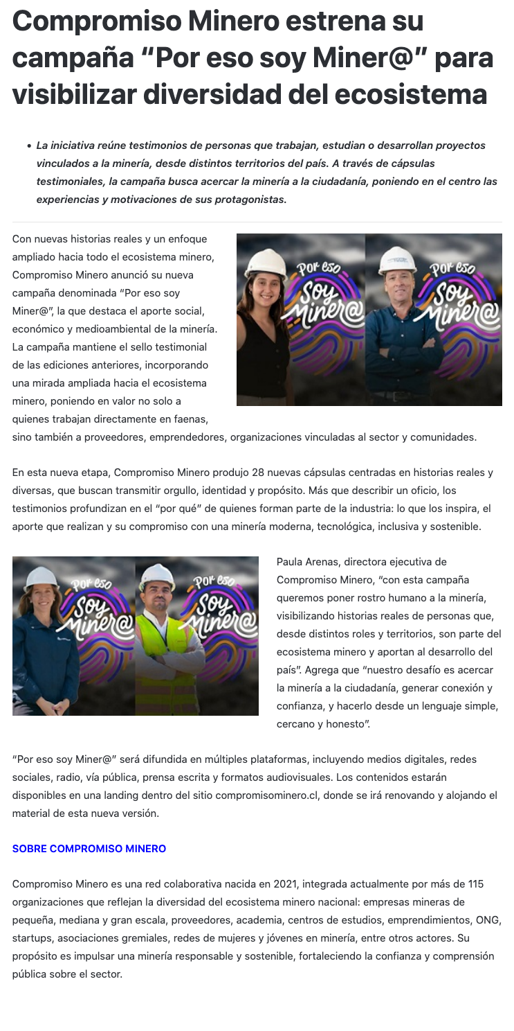 Compromiso Minero estrena su nueva campaña “Por eso soy Miner@” para visibilizar la diversidad del ecosistema - (mediabanco.cl)