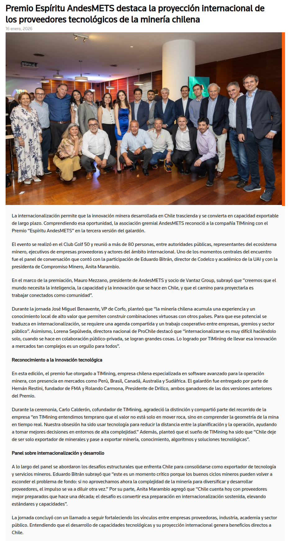 Premio Espíritu AndesMETS destaca proyección internacional de los proveedores tecnológicos de la minería chilena - (guiaminera.cl)