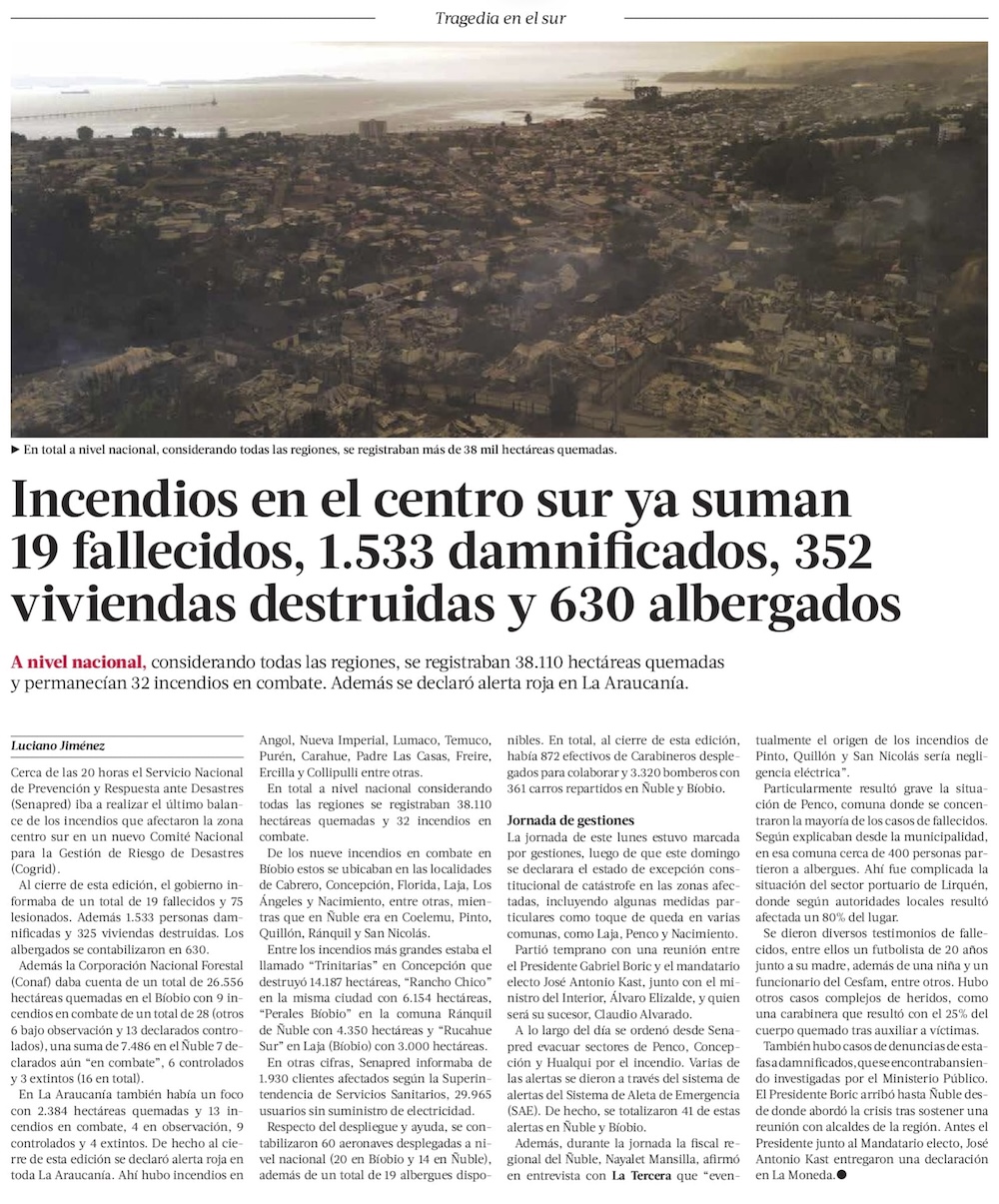 Incendios en el Biobío y Ñuble generan pérdidas iniciales por más de US$ 400 millones - (El Mercurio de Santiago)