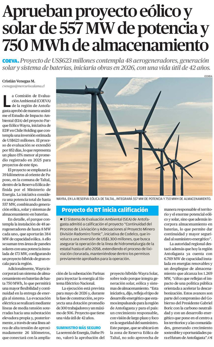 Proyecto eólico por más de US$ 600 millones obtiene la aprobación ambiental - (Pulso)