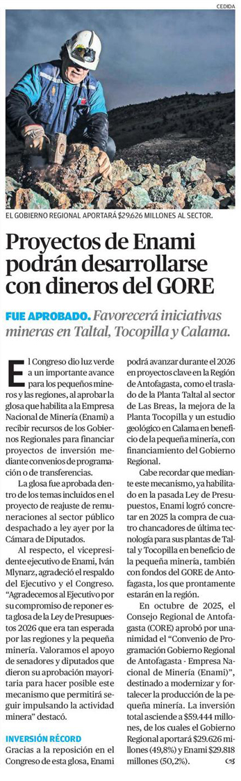 Proyectos de Enami podrán ser financiados por gobiernos regionales - (El Diario de Atacama)