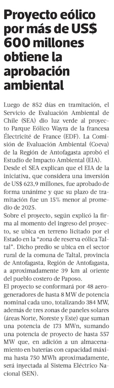 Aprueban proyecto eólico y solar de 557 MW de potencia y 750 MWh de almacenamiento - (El Mercurio de Antofagasta)