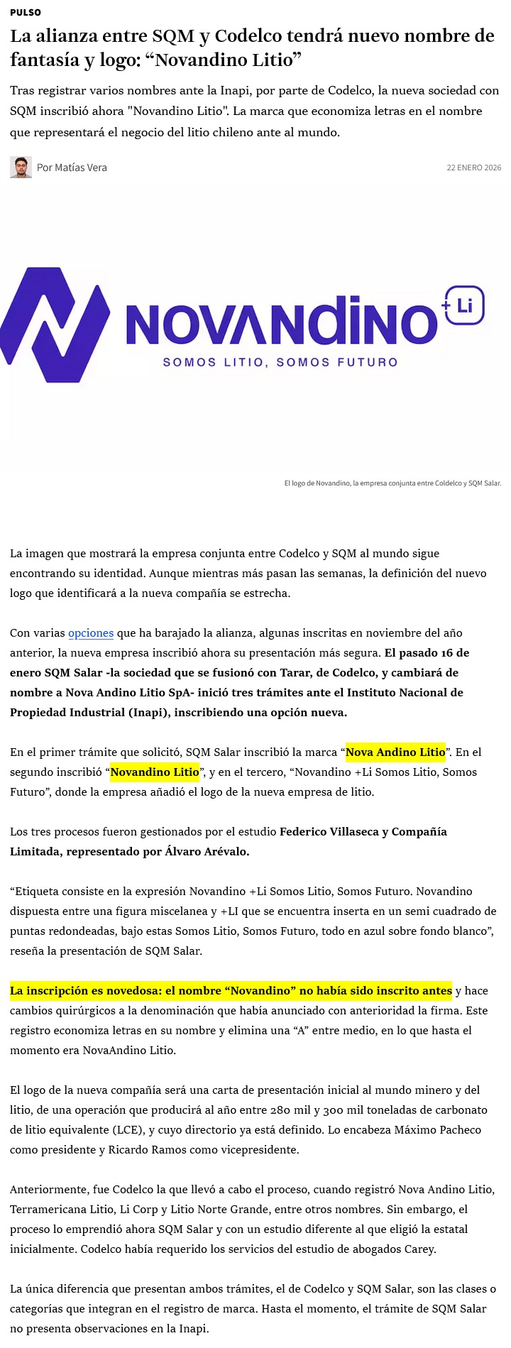 La alianza entre SQM y Codelco tendrá nuevo nombre de fantasía y logo: "Novandino Litio" - (Pulso)