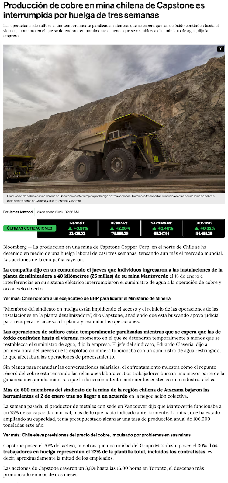 Mantoverde entra en fase crítica: minera dice que operación se detendrá en horas si huelguistas no liberan suministro de agua - (Diario Financiero)