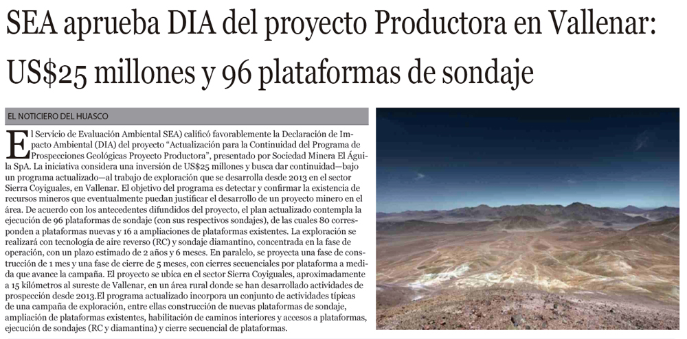 SEA aprueba DIA del Proyecto Productora en Vallenar: US$25 millones y 96 plataformas de sondaje - (radioamigavallenar.cl)