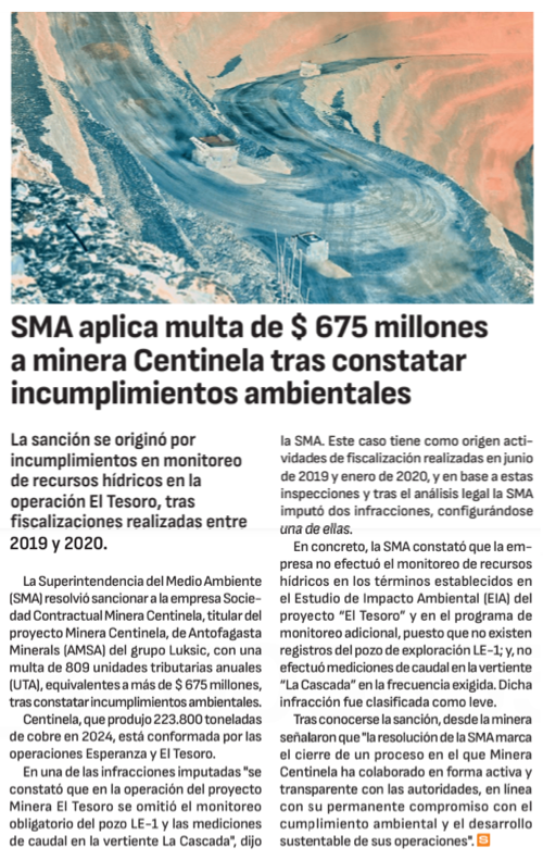 SMA aplica multa de $675 millones a minera Centinela por incumplimientos ambientales - (soyantofagasta)