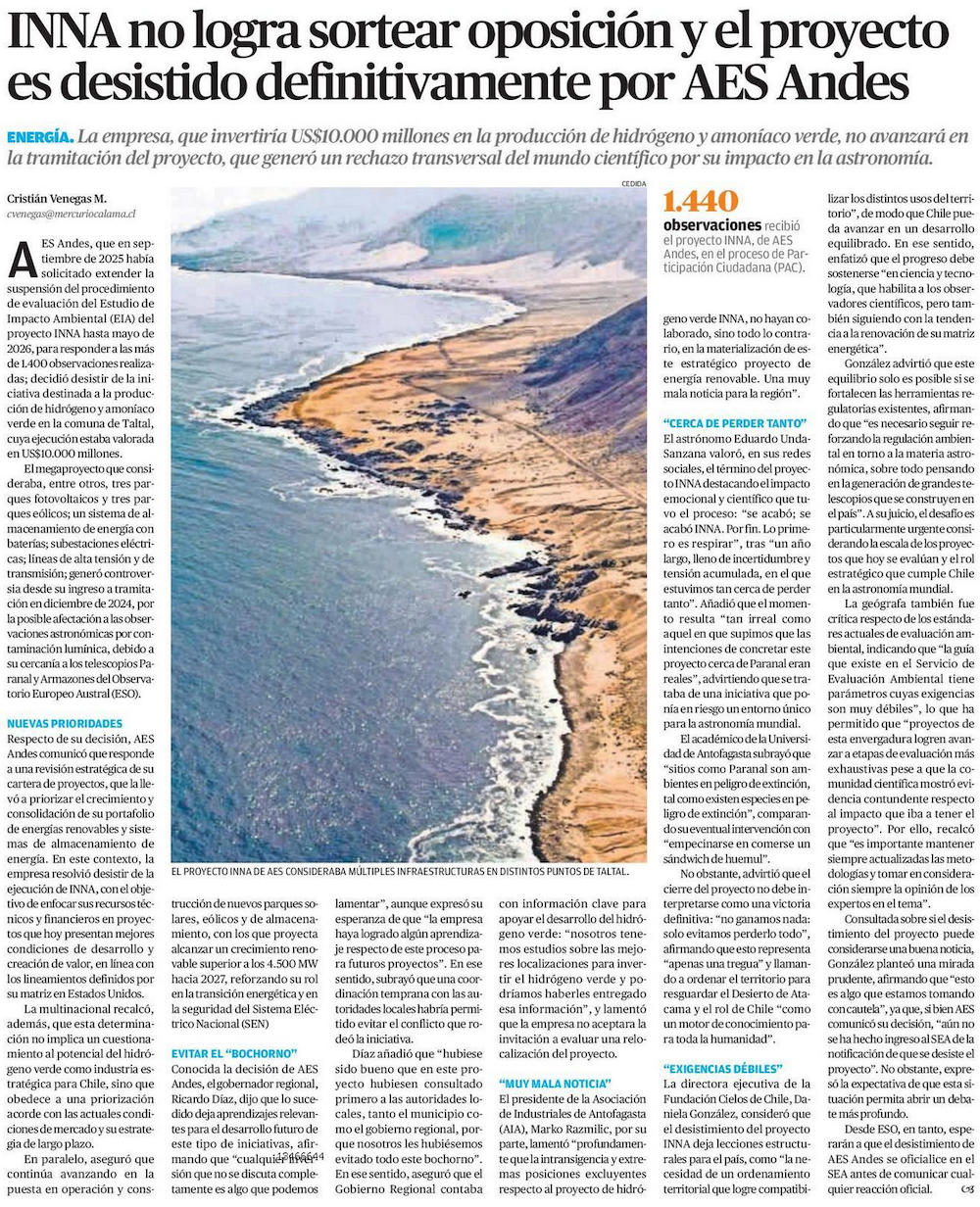 AES Andes desiste de proyecto de hidrógeno verde que causó controversia con astrónomos - (El Mercurio de Santiago)