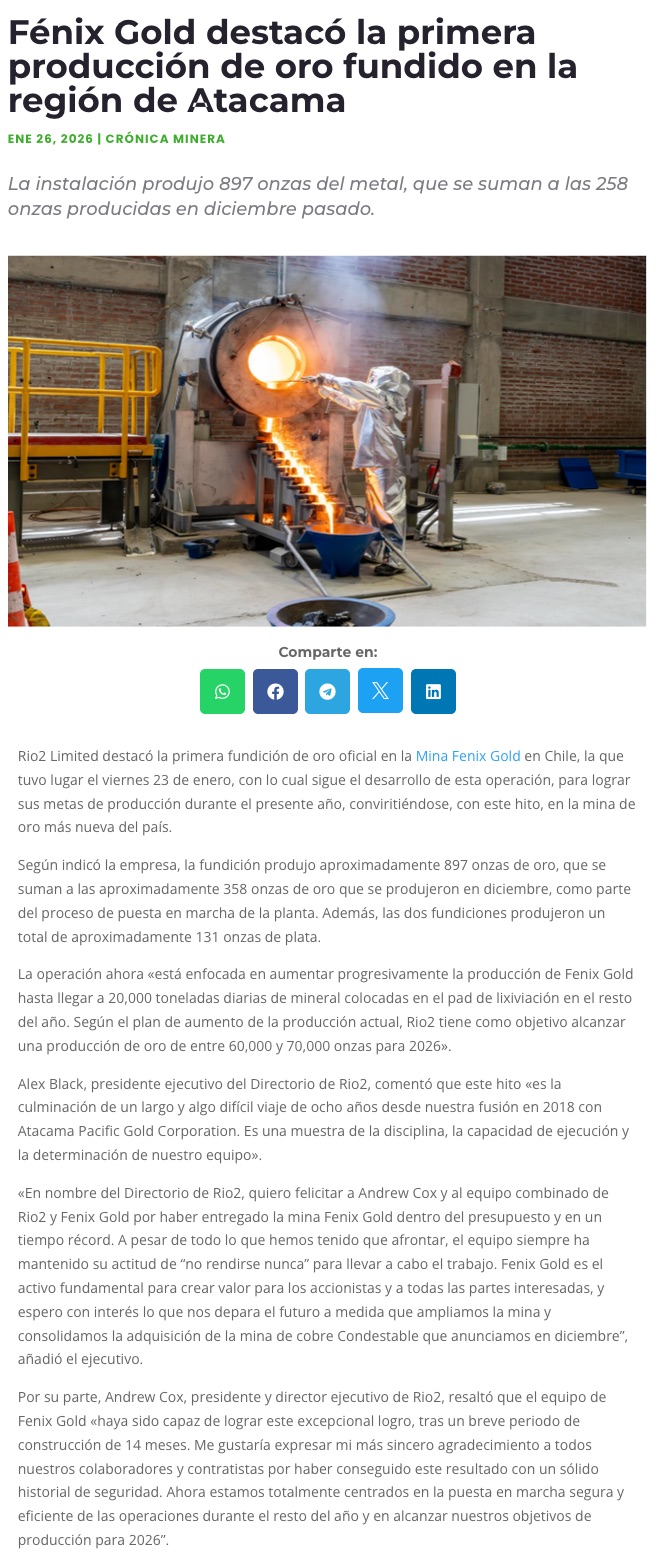 Rio2 realiza su primer vertido de oro en Fenix Gold - (reporteminero)